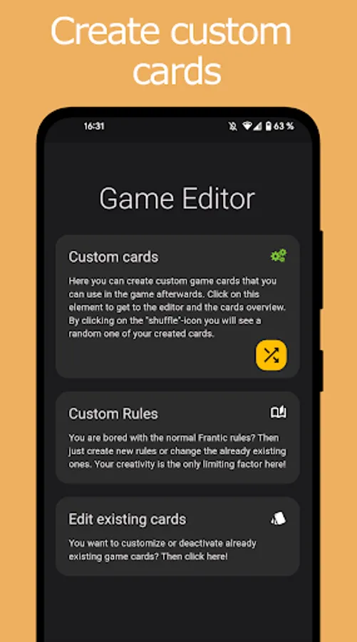 Are the standard cards and rules too boring for you? Then just create new cards, or edit already existing ones. You can also share your own created cards with friends!