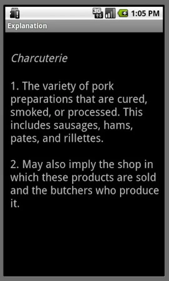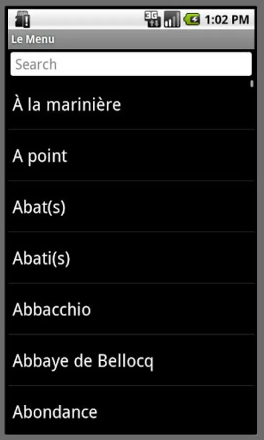 Le menu is a dictionary of French food, containing two thousand words commonly found on French restaurant menus and words related to French food in general. It has the names of popular dishes and of many ingredients in the food. All the words are translated into English and many have more detailed information about the dish.