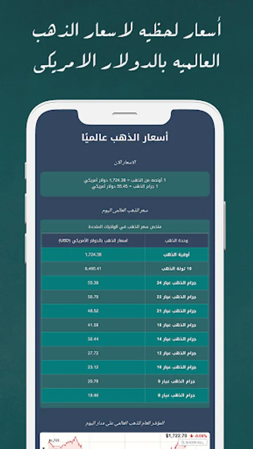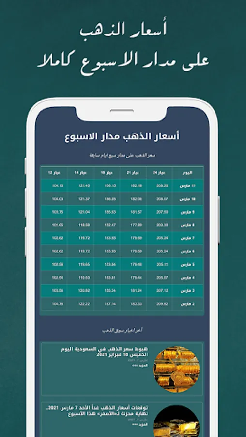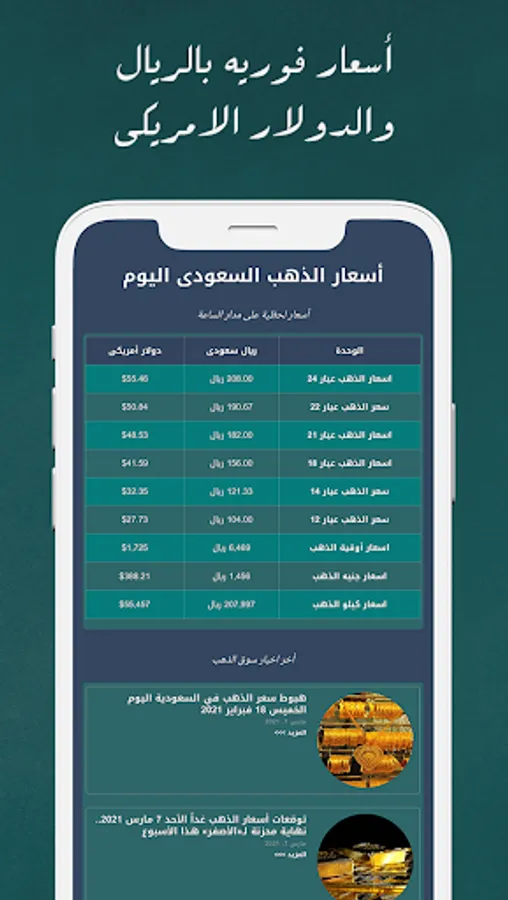 The application shows you real-time prices for the price of gold within Saudi Arabia for different gold carats such as 24 carat gold, 22 carat gold, 21 carat gold, 18 carat gold, 14 carat gold, 12 carat gold, and also the price of an ounce of gold in the local currency, the riyal Saudi