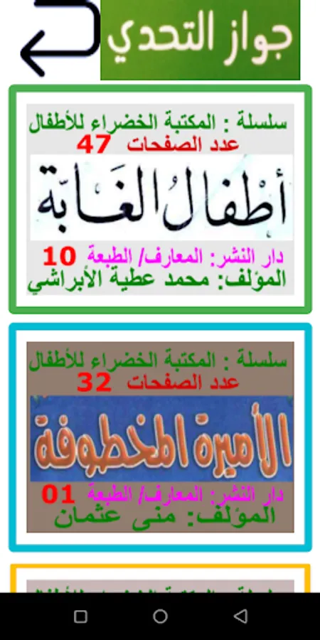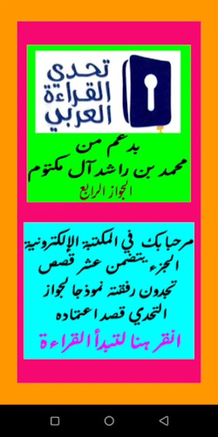 Application named Tahadi tome4. It contains the home page which contains two clickable icons giving the main list and an Arabic text illustrating the content of the application to users