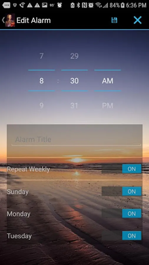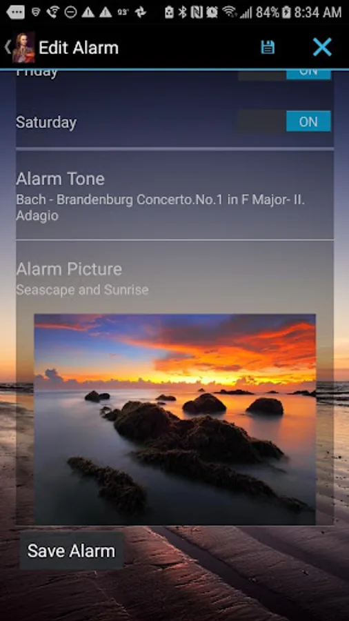 The music starts very softly, then gradually increases in volume to rouse you peacefully, but reliably, from sleep. In the background, beautiful scenery with oceans, flowers, forests, and mountains start dark and slowly brighten, simulating the morning sunrise.