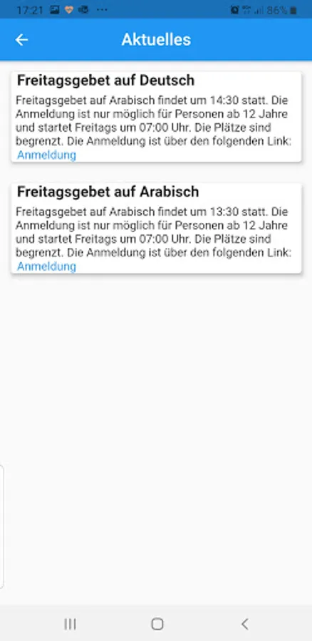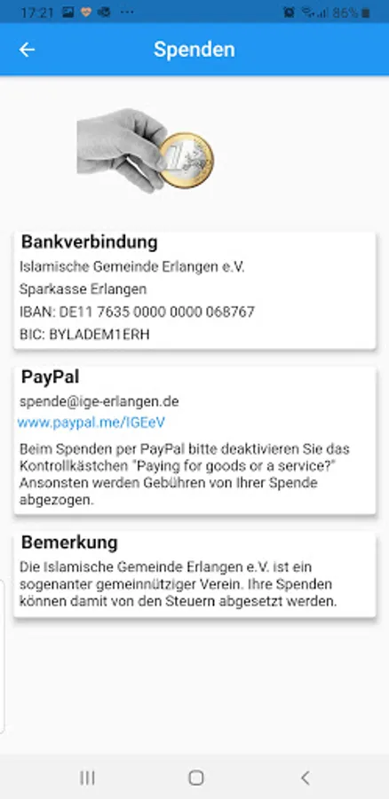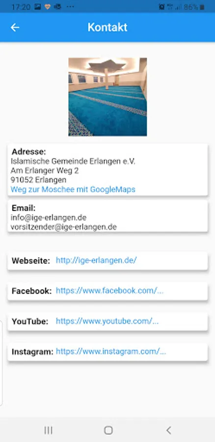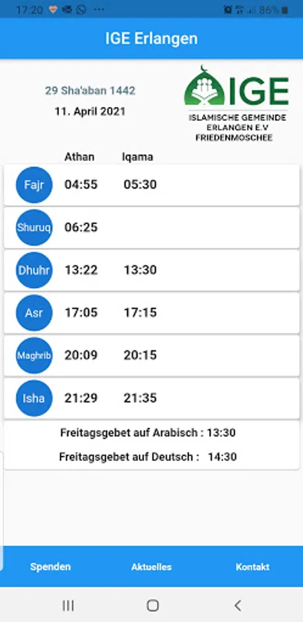 The app offers an overview of prayer times, contact information and current reports from the Islamic Community of Erlangen (IGE Erlanegn e.V.).