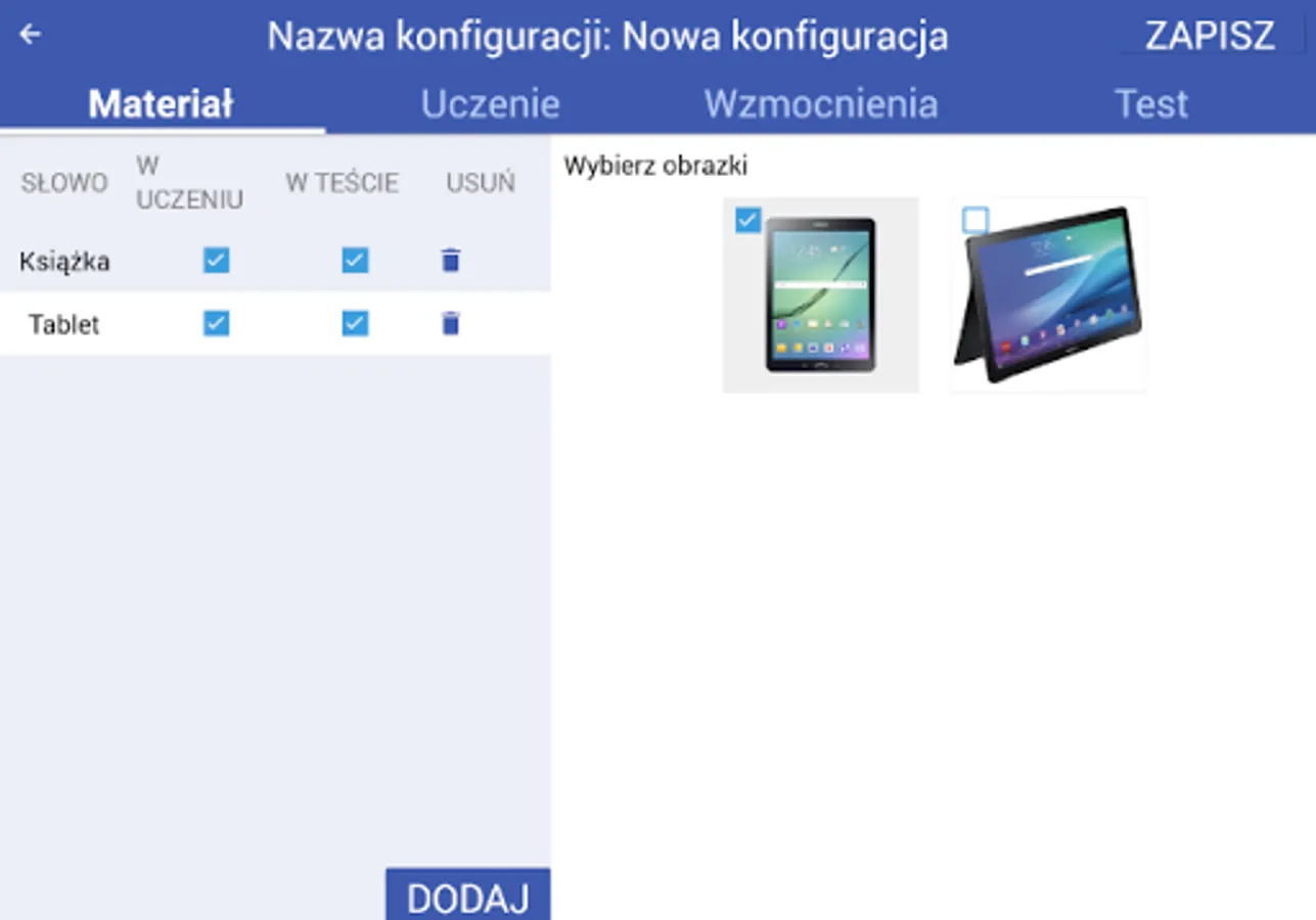 The application allows you to add materials (words and pictures) that can be used in many configurations, but in each configuration you can specify which of the images from a given material are to be displayed during the game and whether the material should appear in each game mode (in learning mode and / or in test mode).