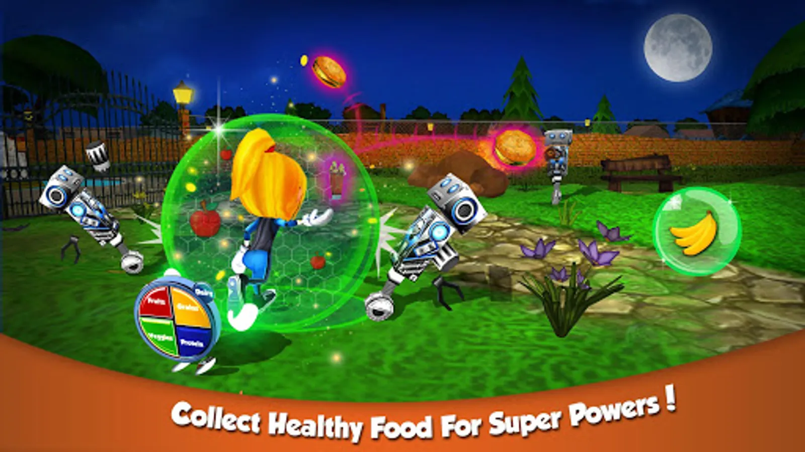 The peace of planet Nutrino is at stake! The evil scientist Dr. Shtoo invaded Nutrino with the fatty, salty, and sugary processed foods to destroy the peace and health of the Nutreans. You MUST fight for the Nutreans!