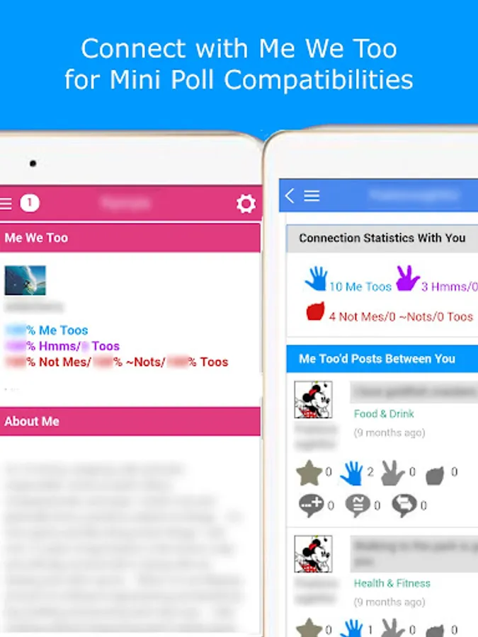 Choose to connect your Me We Too Profile with your Friends Match Me profile to check out your connection stats with other members who have also connected - i.e. your Me Too's/Hmm's/Not Me's on Me We Too posts. You can click on their Me We Too profile to get more info on what posts you agree on/disagree on.