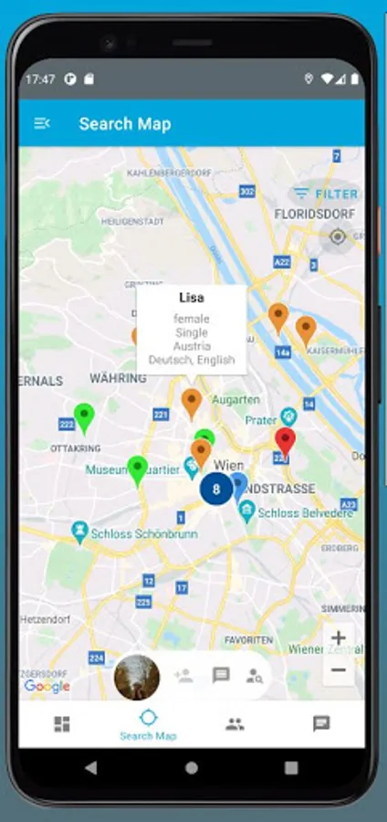 With the radar function you can see and meet people around you, your friends as also other Friendy users.