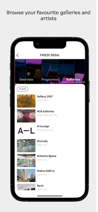 Make the most of your visit by exploring the fair events programme and any perks exclusive to Frieze members. Discover what galleries, museums, cultural institutions, restaurants and Frieze partners have in store during Frieze Week; and navigate the fair with ease by using the mobile-optimised venue floorplans.