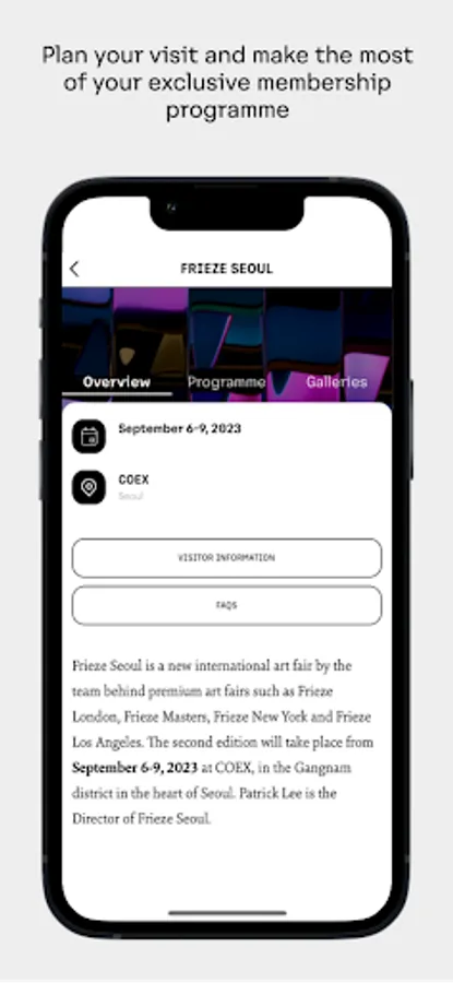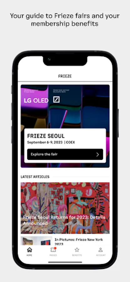 This is the official Frieze app for members and invited guests. Easily access your VIP pass to attend Frieze international art fairs in London, New York, Los Angeles and Seoul – and take part in a year-round programme of members-only events.