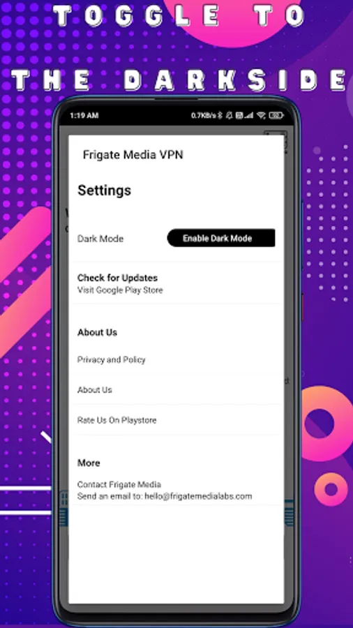 Frigate Media VPN is a lightning-fast app providing a free VPN service. Does Not need any special configuration simply click and connect.