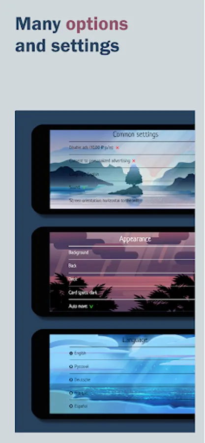 PORTRAIT AND LANDSCAPE ORIENTATION - the game is designed for mobile phones. In landscape orientation the cards are larger and it is more convenient for a spider with the difficulty "One suit". However, if you decide to play "Four suits", the cards may not fit into the columns and it is better to set the portrait orientation. For difficulty "Two suits" it is convenient to play with any screen orientation.