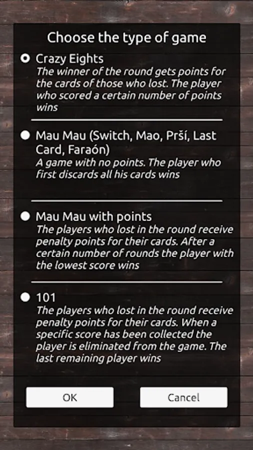 Crazy Eights is a shedding-type card game for two to seven players. The object of the game is to be the first to get rid of all the player's cards to a discard pile. There are many variations of the basic game, and a number of different names including Craits, Last One, Mau-Mau, Pesten, Rockaway, Swedish Rummy, Switch, Last Card, Screw Your Neighbour, Püskiyon, and Tschausepp. You can play most of these games.