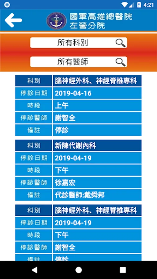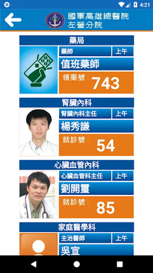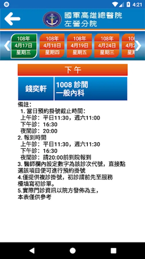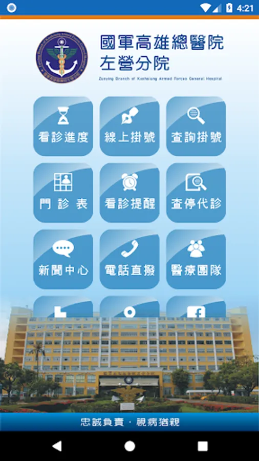安裝國軍左營分院APP「行動資訊服務系統」,讓您隨時隨地一手掌握就診資訊,包括看診進度、看診提醒、行動掛號、門診表、停代診資訊、最新消息、醫療團隊介紹、交通資訊、電話快撥等服務,歡迎民眾踴躍下載使用。我們也將不定期提供系統功能升級與更新版本。