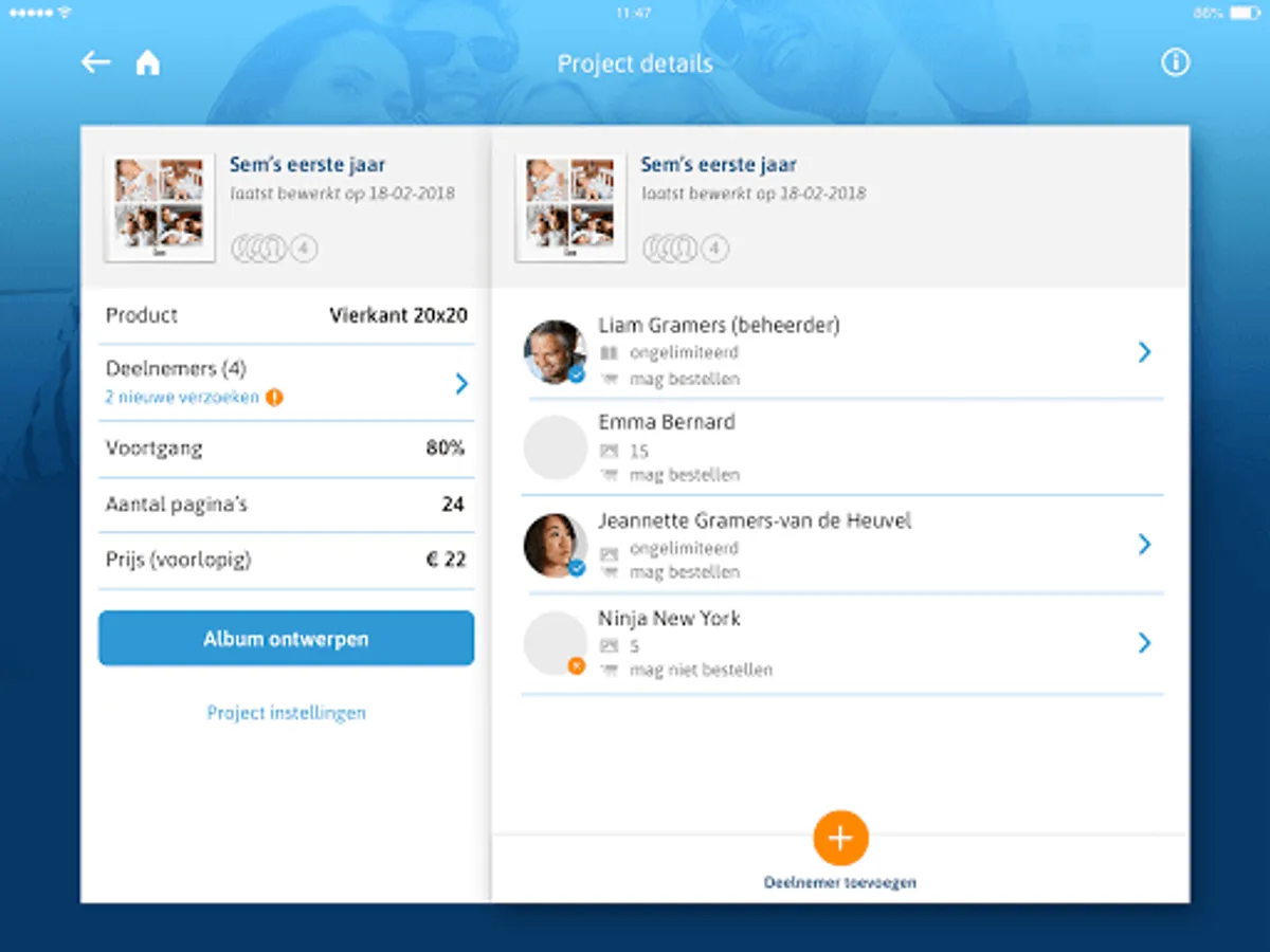 The well-arranged editor is available for smartphone, tablet and PC. This way you can easily work on the same project on different devices. That way you can quickly access your own photos or the photos supplied by other participants.