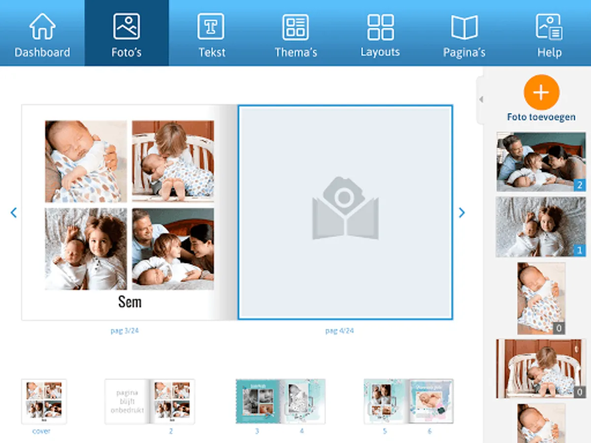 Mix & match different layouts in your photo album. Give your photo album your own vibe with one of the many fonts and colors.