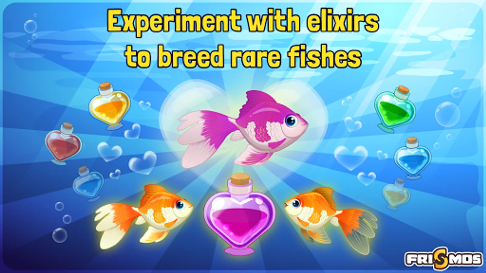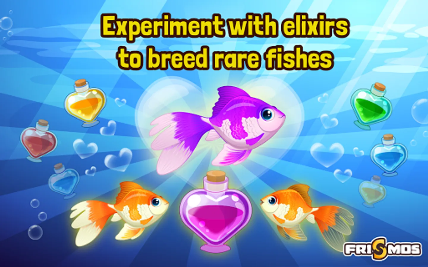 Use special ELIXIRS to add any new color on the fish you want to breed thus creating MULTICOLORED and BRIGHT Fish Tanks.