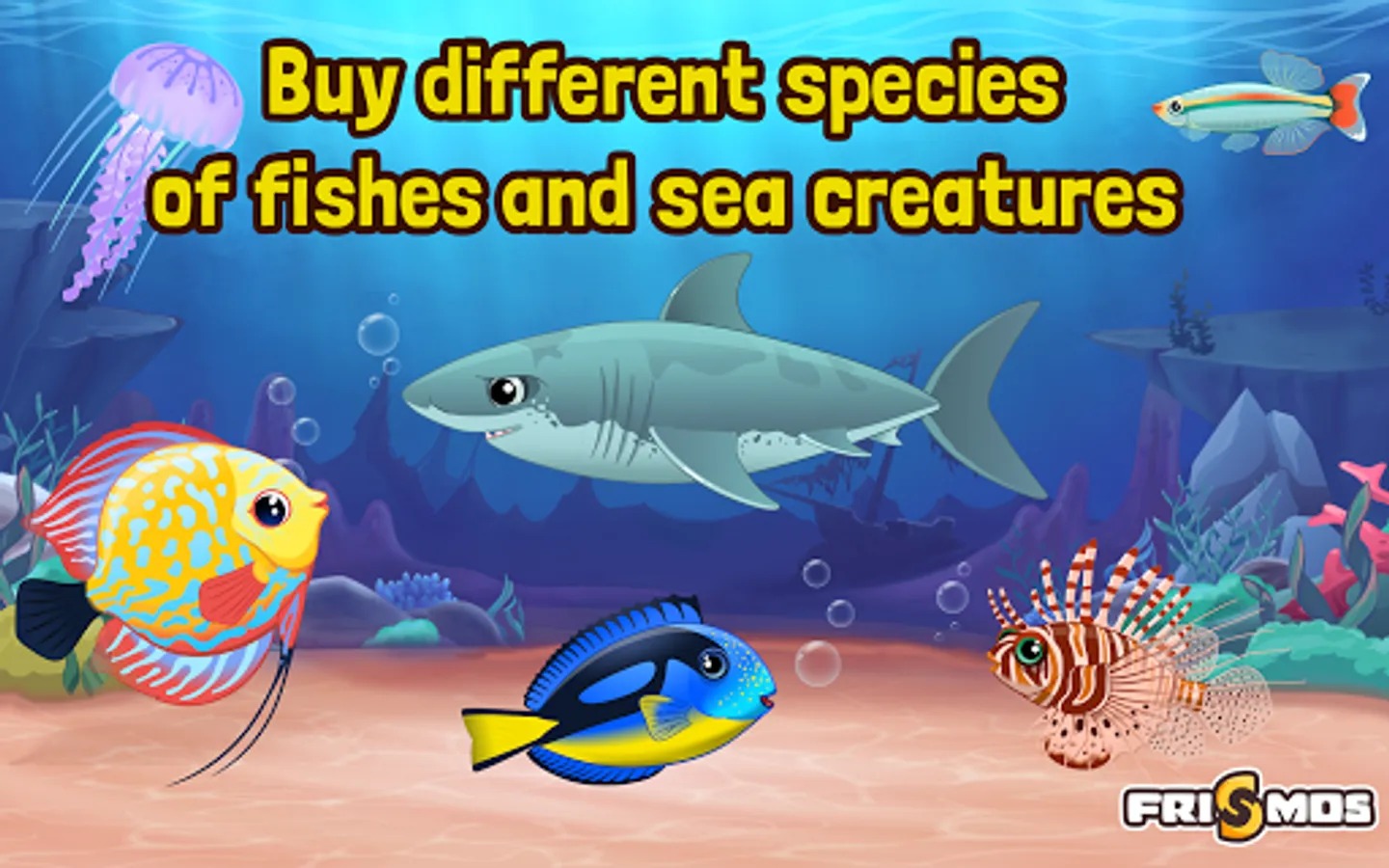 Travel deep underwater and fill your day with joy and excitement with the amazing GOLDFISH, colorful DISCUSES, gorgeous BETTAFISH, stripy SCALARE and many more creatures like SHARK, JELLYFISH, TURTLE and SEAHORSE. Here, you can take care of your fishes by feeding and playing with them because when they are happy they will make you happy for sure.