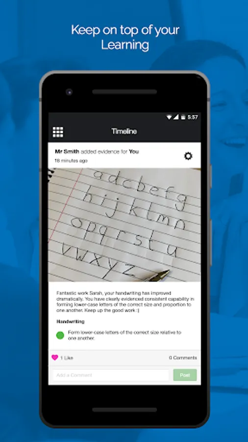 • View the timeline to follow your child’s work live on Frog and add ‘likes’ and comments to support them