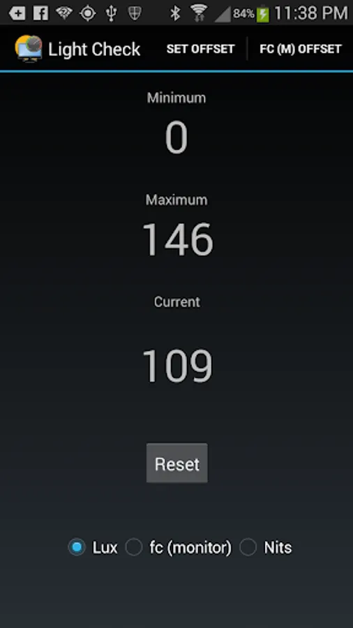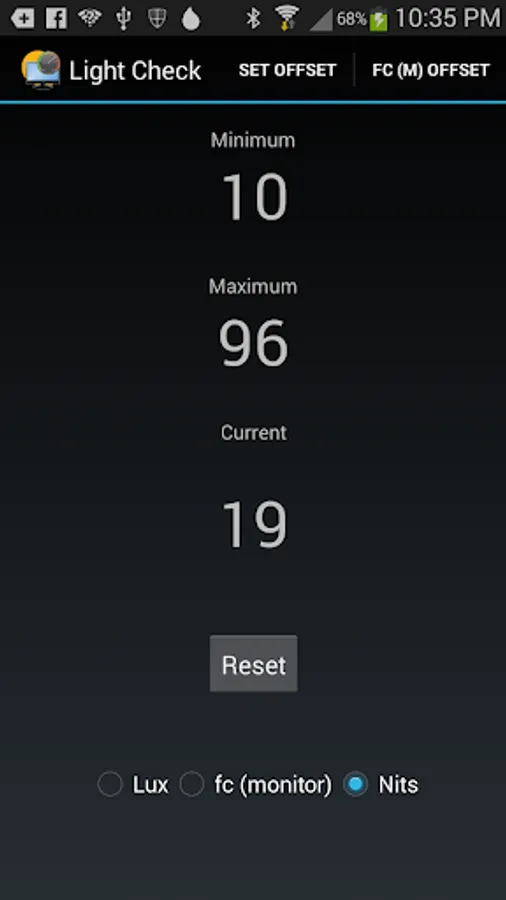 To measure your monitor put up a white field. Start Light check and press Reset. lay your phone on the screen with the light sensor on the white. Pull the phone away and read the Max reading. That should be your monitor's reading. This will work best if the lights in the room are dimmer than the monitor.