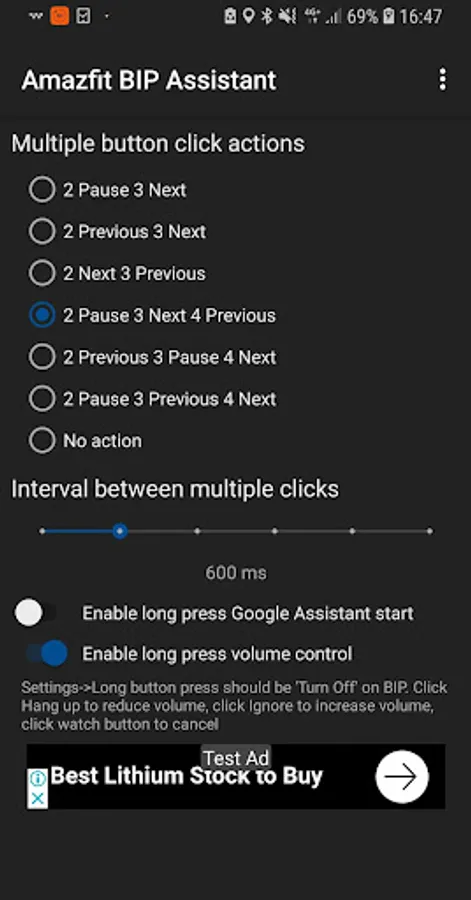 Amazfit BIP Assistant lets you control media like music or videos using your watch. You have ability to customize number of clicks needed to switch to next music track, pause or go the previous track. Furthermore, you can customize delay between multiple clicks.