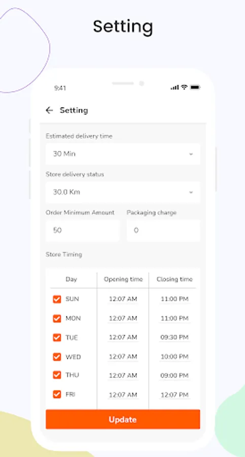 -Manage chef details like chef timing, address, estimated delivery charges, packaging charges, minimum order amount, delivery radius, etc.
