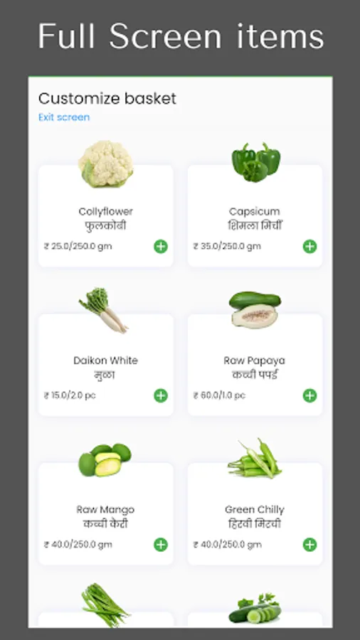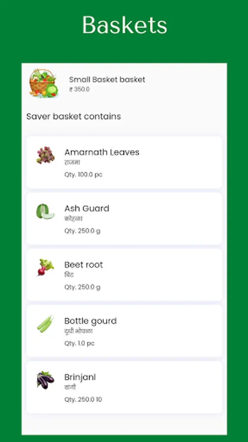 We also provide the Baskets which have the pre-filled vegetables in it. You can choose from Small, medium and large basket. These baskets contain a various number of vegetables varying in quantity and size.