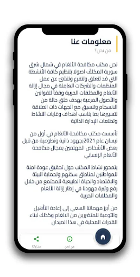 We are the Mine Action Office in northeastern Syria, which is duly mandated to organize all activities that may relate to, branch out, and arise from the work of organizations and companies working in the field of mine and war remnants removal, in accordance with applicable laws and principles, with the aim of creating a state of harmony and coordination with the relevant authorities to conduct them in a way that suits the goals and objectives of the activity.