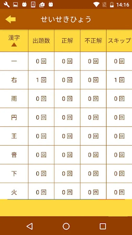 ・成績表画面で各漢字の出題数・正解数・不正解数を確認できます。