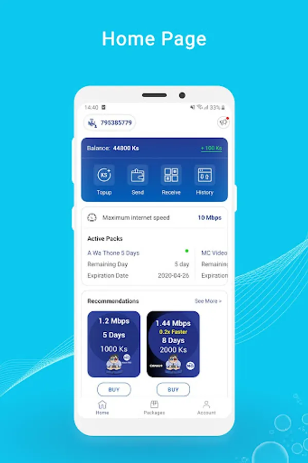 Mobile application for using and managing Myanmar Net: Myanmar Net application will let you top up, check balance and purchase internet plan in an easy and convenient way especially for your prepaid account. The application is designed with user friendliness in mind which will make you feel easy to navigate through all the available features. Once you open the application, you will see informative Home screen where you can see your current balance and internet plan with a quick glance.