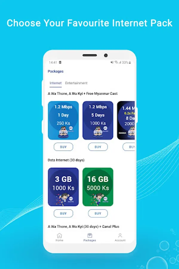 • Purchase internet packages with unlimited data
