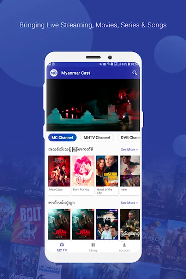 Myanmar Cast is the mobile application for Myanmar Net’s internet TV subscription service. It welcomes you with a library full of media entertainment programs for you to enjoy. We partner with famous media content providers to bring you a variety of news, programs, shows, and much more. Myanmar Cast offers the best Myanmar Movies, news updates, MTV songs, lifestyle programs, and educational shows. Myanmar Cast is brought to you by Frontiir.