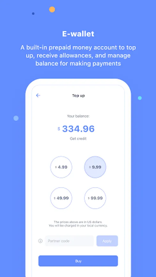 A built-in prepaid money account to top up, receive allowances and manage balance for payments to