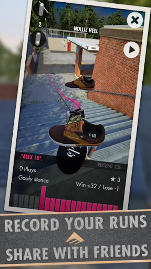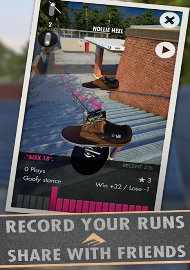 Skater allows you to save your favourite trick runs and share them with the world. In turn, you get to discover and copy runs that other players have created – giving you access to an endless feed of new ideas to explore.