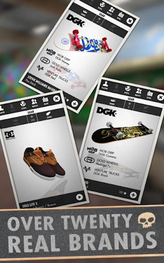 Pick from the latest shoes and decks to skate with; DC Shoes, DGK, Revive, etnies, Emerica, éS, Foundation, Lakai, Toy Machine, Zero, Baker, Deathwish, Shake Junt, Amgrip, Spitfire, Thunder, Venture, Pig Wheels, Force and Bro Style – they are all already included in the game.