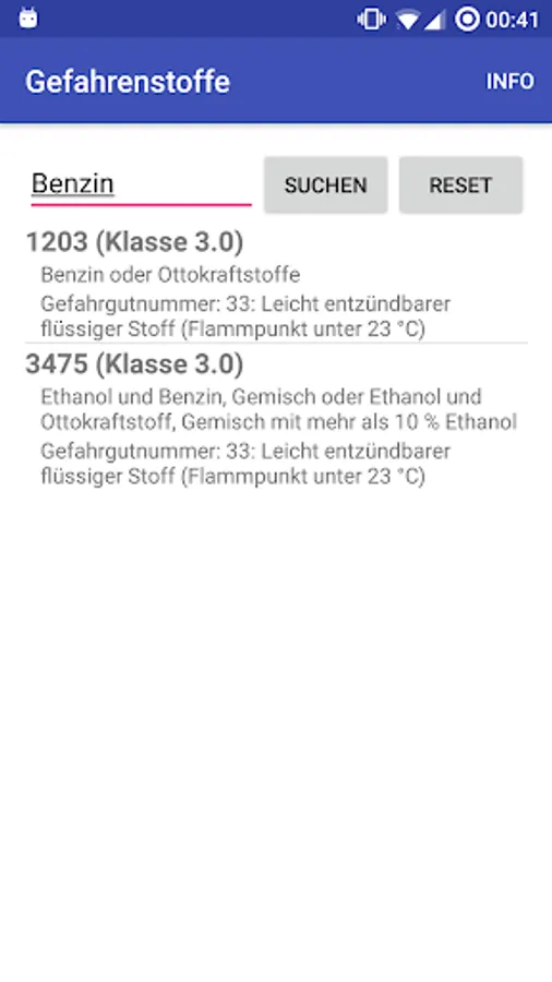 The material numbers shown in the app be located within sealed containers / barrels and label the substance located therein (1203, for example, gasoline) and the risk number (for example, 33 for highly flammable). This is especially important for first responders and emergency personnel to determine how to proceed. For example, some substances may not be extinguished with water, for example, which could cause a serious reaction. Using a fast and accurate search algorithm, the list can be filtered, allowing quick access to the information.