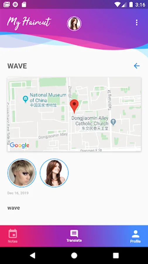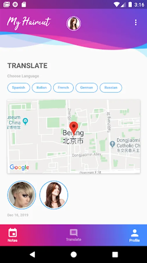My haircut allows you to save your haircuts and view them any time any where. Use the built in translation page to translate your haircut into a range of different languages to speak to hairdressers all around the world!