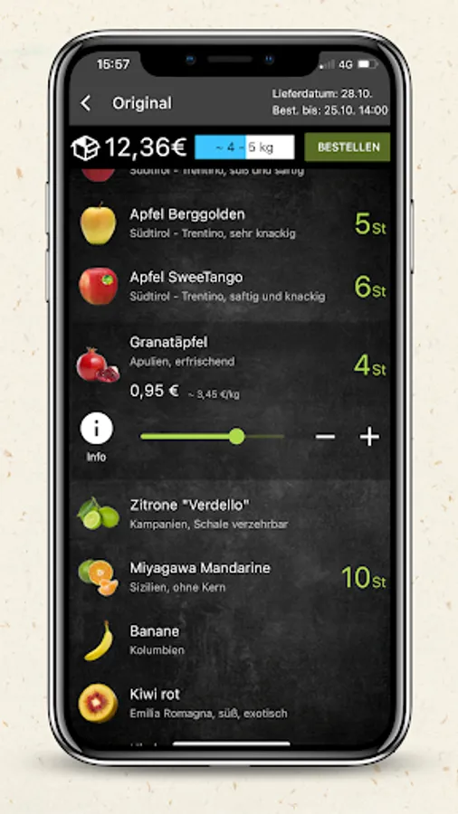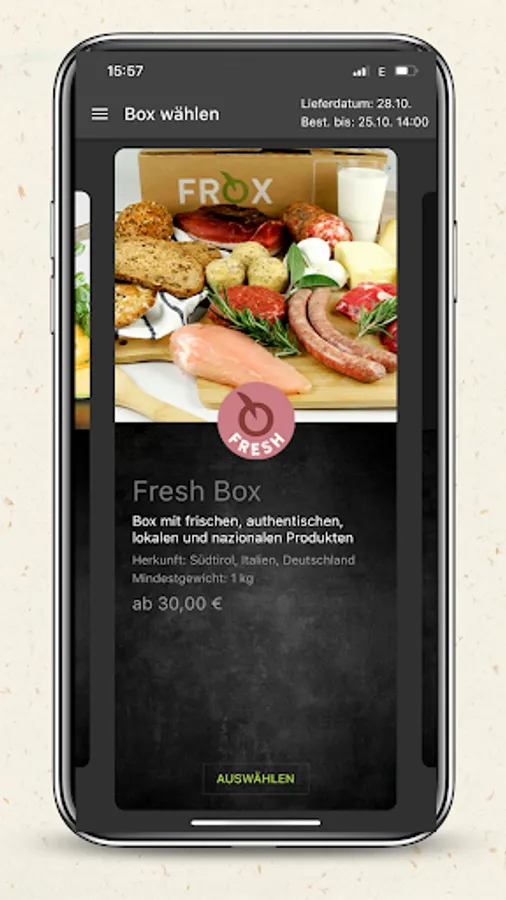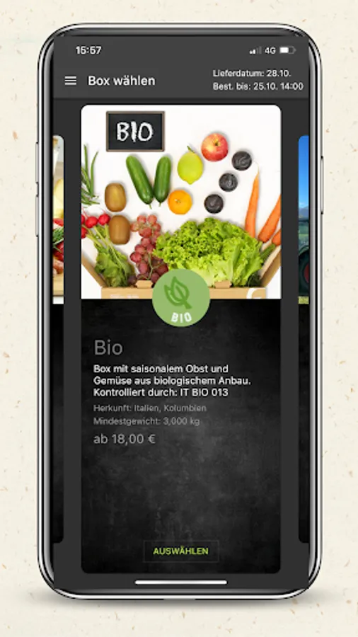 Seasonal, freshly harvested fruit and vegetables, regional and fresh specialties from South Tyrol (we are partners of "Red Rooster") and Italy await you on our app. Choose between the original box or the organic box for fruit and vegetables, the fresh box with many regional specialties and high-quality everyday products, and the special box for seasonal promotions.