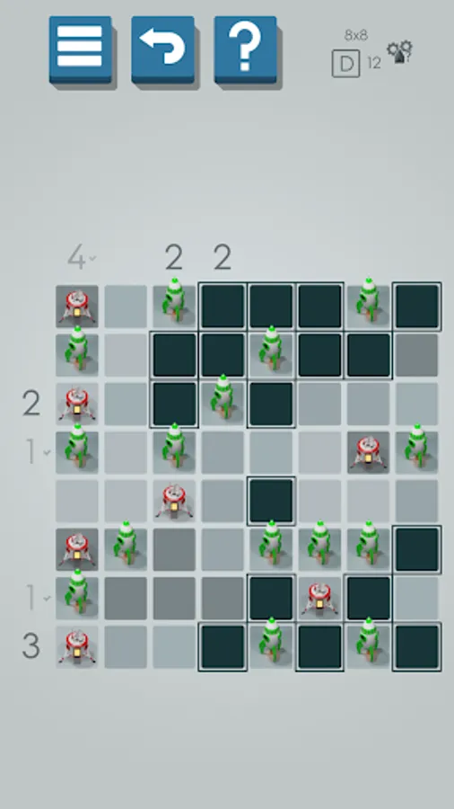The numbers around the grid tell you how many tents must be placed in each row and column. Be careful, tents can’t touch each other.