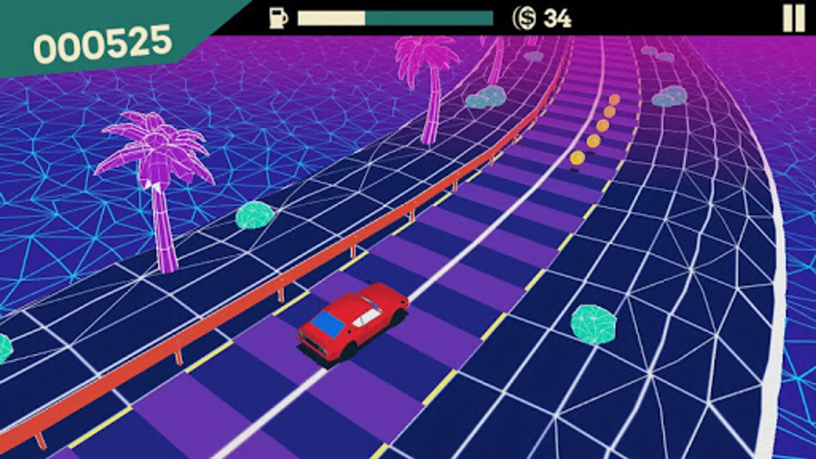 Features 80s inspired synthwave music to pump up the experience, drive fast, jump over ramps, drift and collect coins, just make sure you don't hit anything on your way!