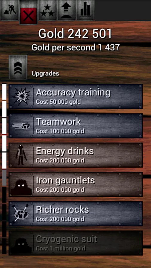 Mine gold by shattering rocks. Collect enough gold to buy workers, upgrade them to be more productive. Buy upgrades for your own mining capability, reach milestones, unlock special rare rocks. Each worker and upgrade has flavor text for you to discover their small stories. Have fun and go idle!