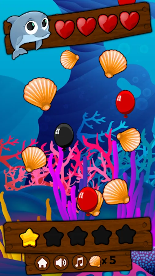 Catch as many shells as possible and help this dolphin complete his collection. Watch out for black balloons that will make you lose hearts. If necessary, the red balloons will save your life.