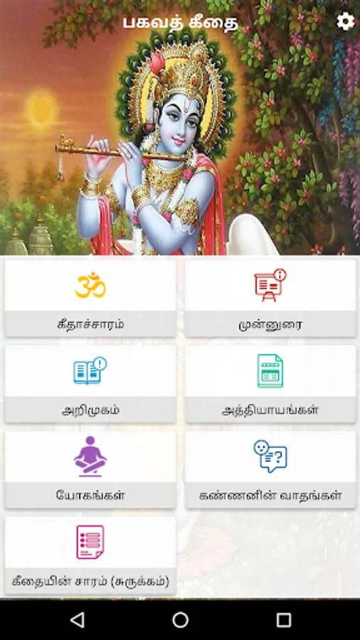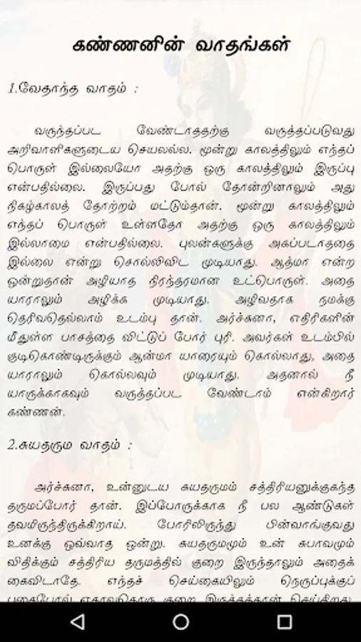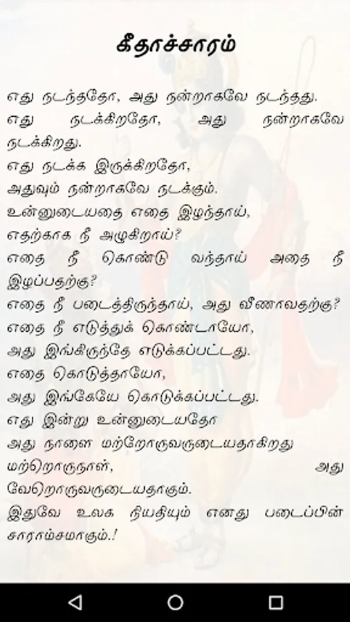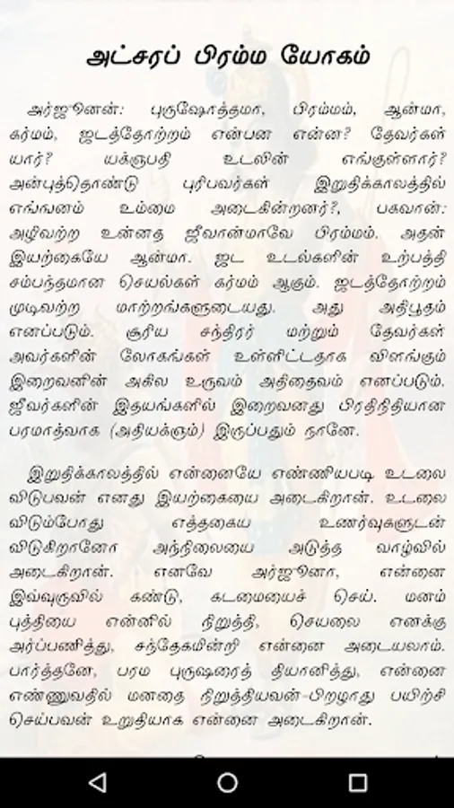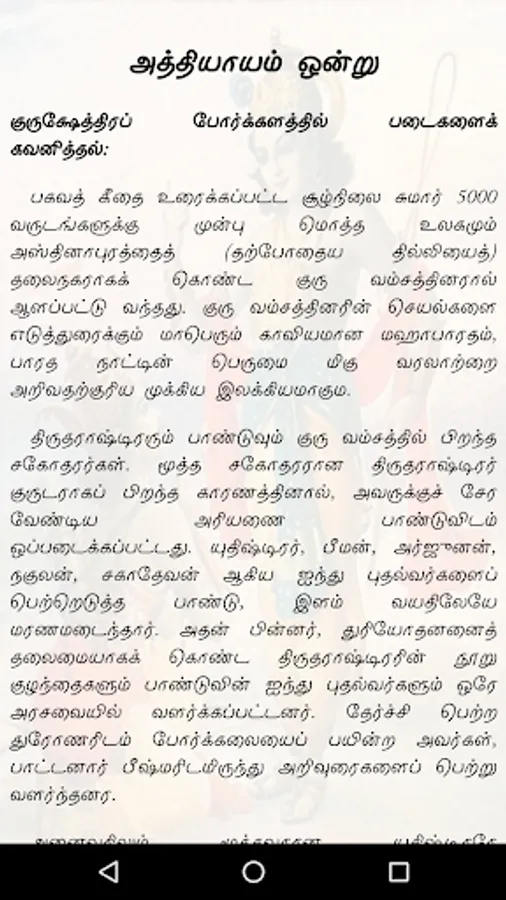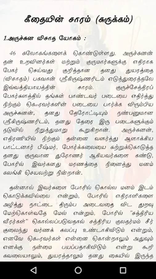 Before the beginning of the Kurukshetra war in the Mahabharata, Aruchunan once visited the opposition and refused to fight because of his relatives, friends and teachers. Seeing this, his charioteer, Krishna, explained that while fighting for Dharma, relations cannot be interrupted. In that description he spoke of philosophies and yogas. These dialogue ideas are the Bhagavad Gita. Of these, 620 slokas are spoken by Krishna, 57 by Arjuna, 67 by Sanjayan, and one by Sloth, by Thirutharashtra, with a total of 700 slokas and 18 chapters.
