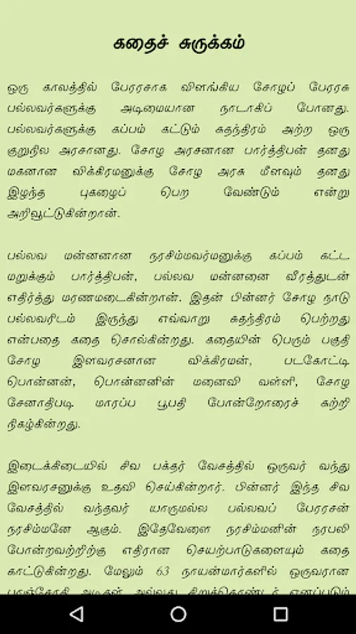 Parthipan, who refuses to pay tribute to the Pallava king Narasimhavarman, dies bravely against the Pallava king. The story tells how the Chola country gained independence from the Pallavas. The bulk of the story revolves around the Chola prince Wickraman, the sailboat Ponnan, Ponnan's wife Valli and the Chola general, Marappa Bhupathi.