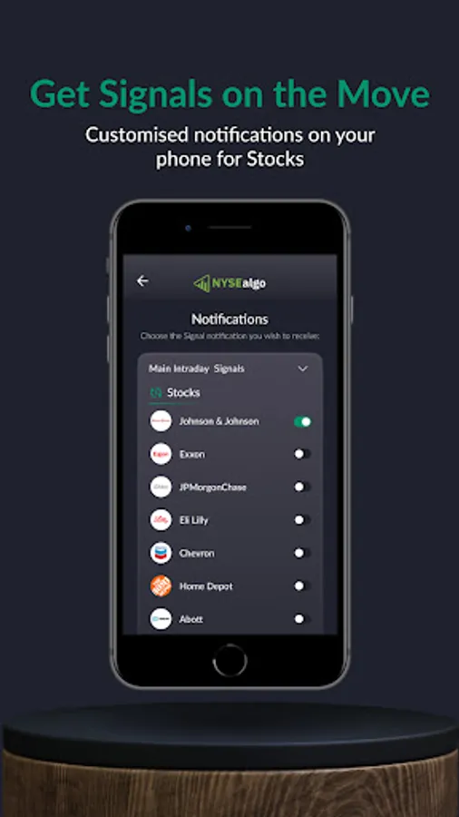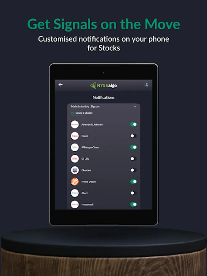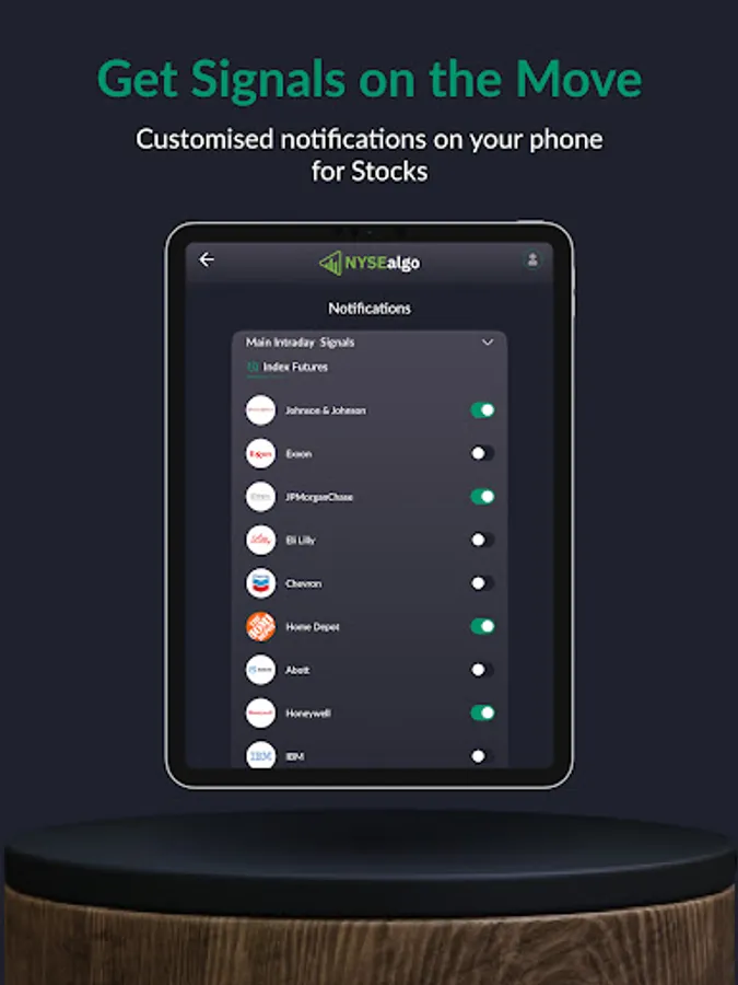 AI powered Stock trading signal mobile app for Stock & Index Traders on NYSE Exchange USA. You can get trading insights for Stocks, Dow Jones, E-mini S&P, Nasdaq and Russell indices. You can trade 30+ stocks with the trading signals provided in this mobile app. These are top traded stocks on NYSE such as J&J, Exxon, JPMorgan, Eli Lilly, Goldman Sachs etc.