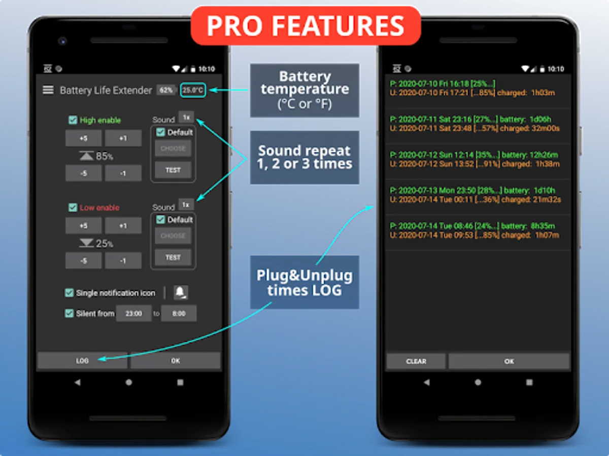 The log of the plug and unplug times will log every charging cycle including time and battery level as well as the duration of each cycle. This will help you better assess how long the charging process takes and how long you are running on battery. There is no limit on the number cycles recorded, and you can delete them individually or as a whole.