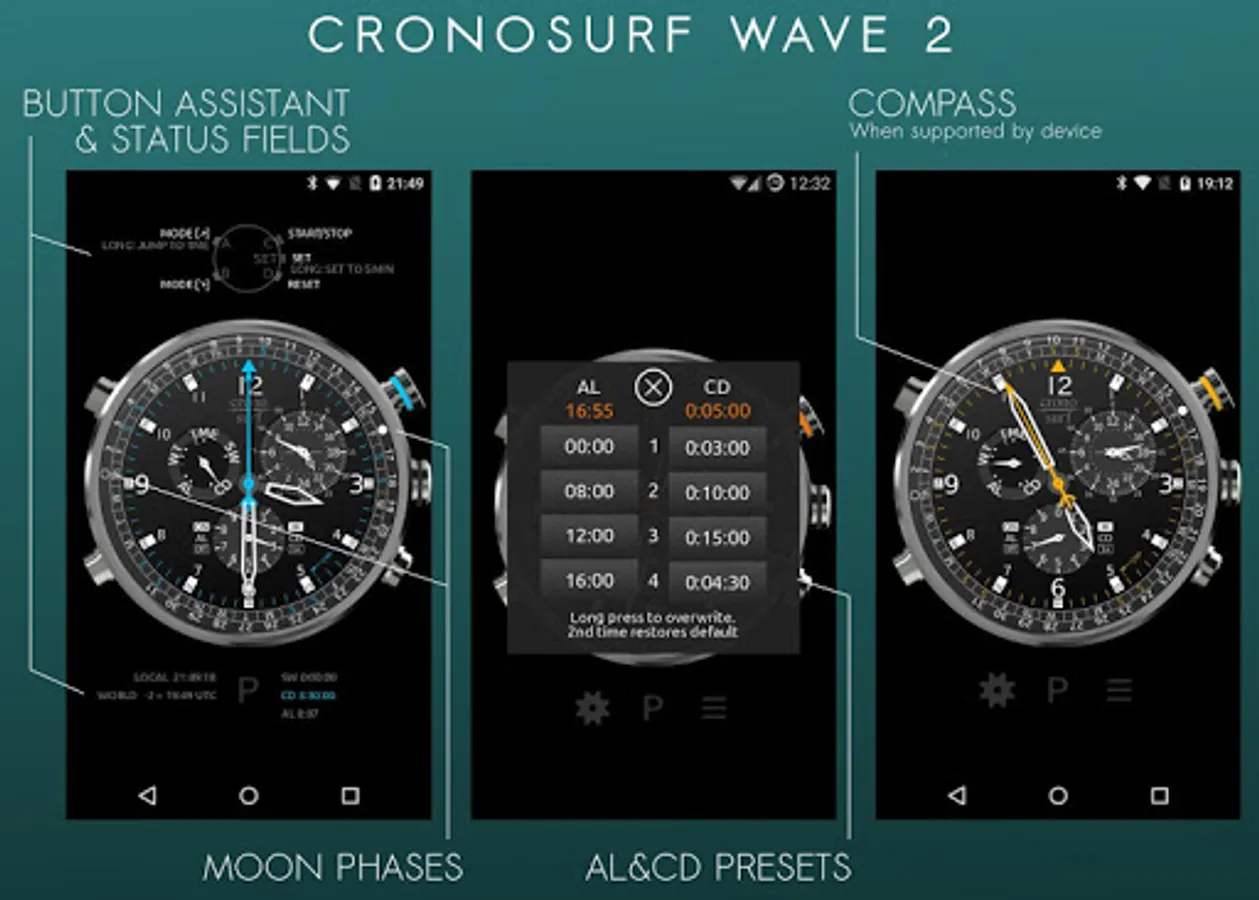 Cronosurf Wave is a chronograph watch app for Android devices and a watchface for Wear OS! No other OS are supported for now. SOME UNSUPPORTED OS include: Tizen (Samsung GEAR, GALAXY 3 and earlier), Garmin, HarmonyOS (like Huawei Watch GT2).