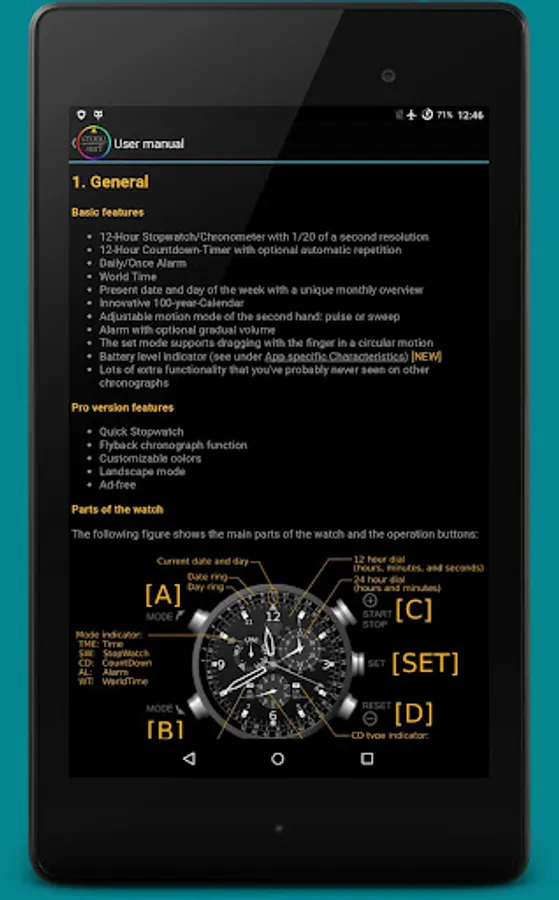 Since Cronosurf has many features, the app includes a comprehensive user manual. The Button Assistant is now integrated in the app (portrait mode). Use it to quickly getting familiarized with the basics. To activate it, tap on the area above the watch.
