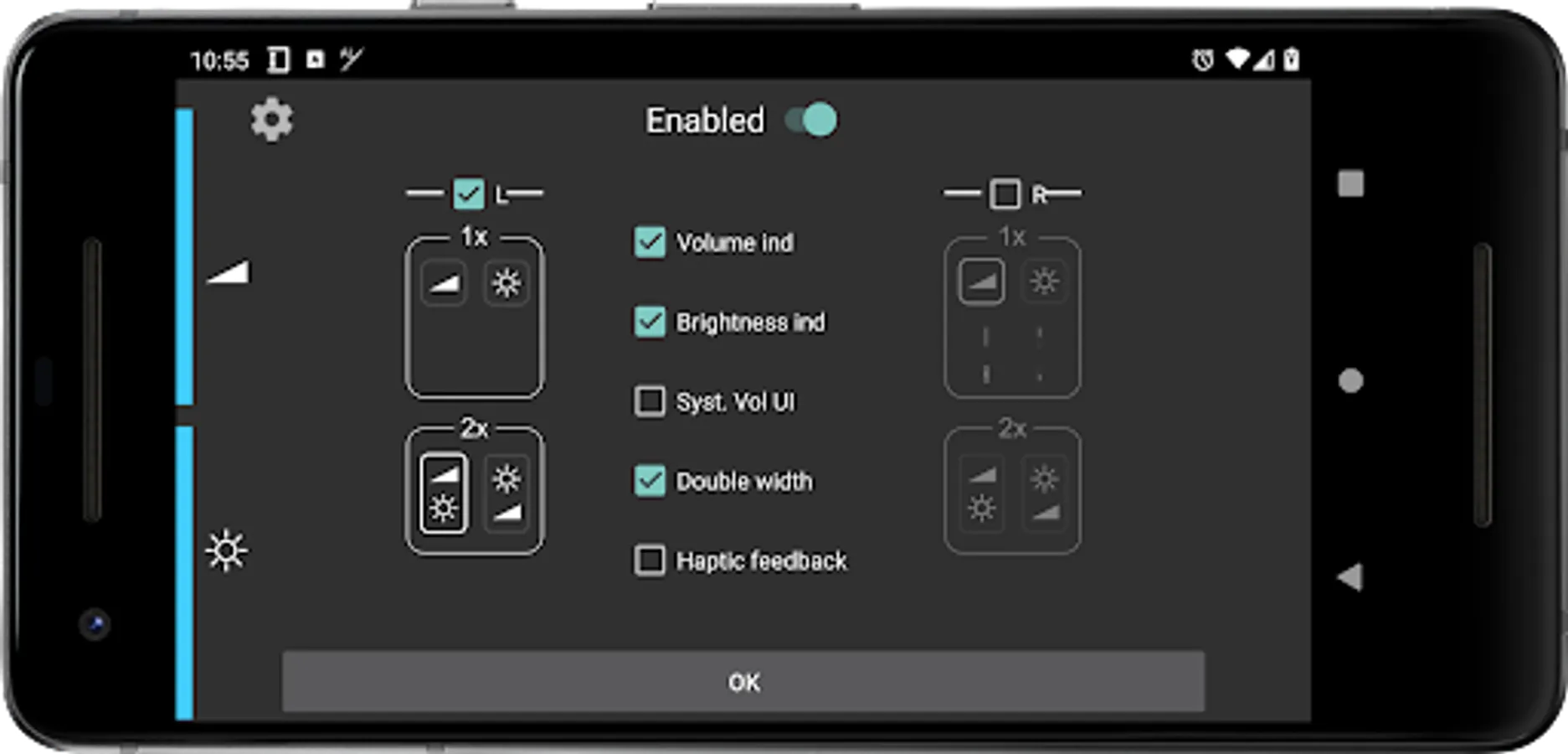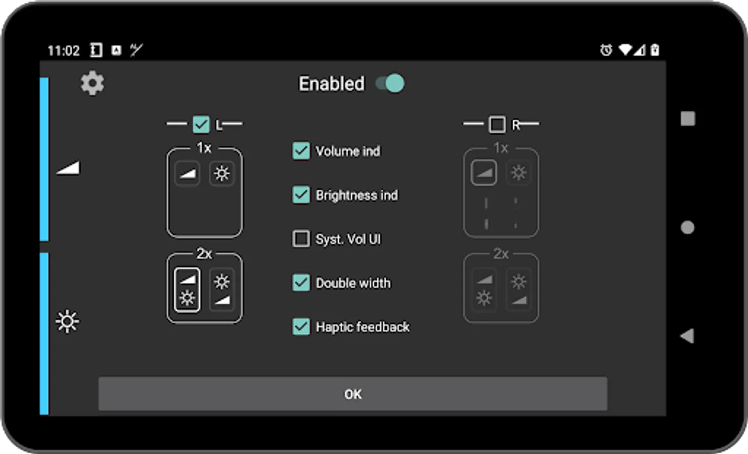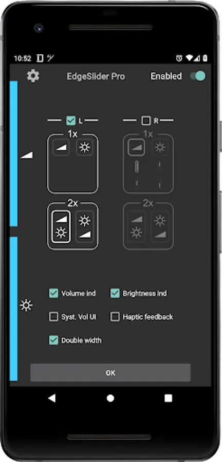 - Fully customizable volume AND/OR brightness control: control only volume, only brightness or both, left or right side or both at the same time, full or half height with top, bottom or center positioning
