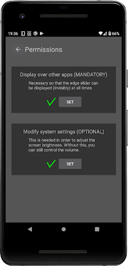 2. Modify system settings: This is needed only for controlling the screen brightness. If you plan to use EdgeSlider for volume control only, you may leave this permission disabled.