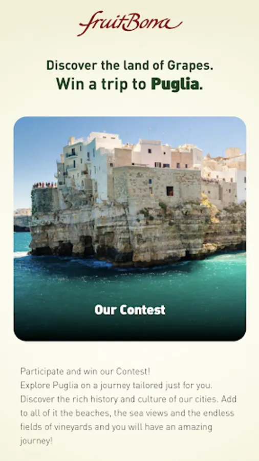 Tha app is aimed at participating a contest, promoted by Nava, to win a trip to Puglia, to come visit Nava vineyards and discover our beautiful region.