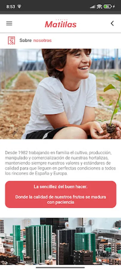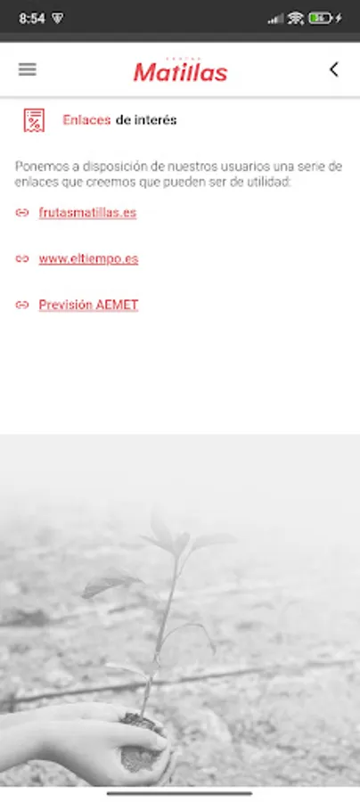 The Frutas Matillas app includes information, contact details, and useful links. It also features a private area for Frutas Matillas farmers to access information.